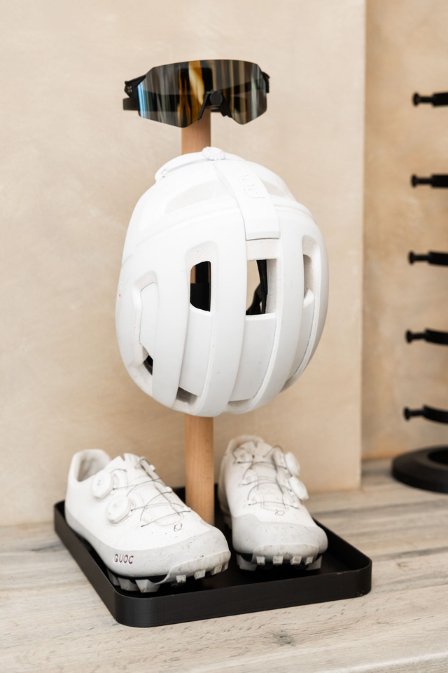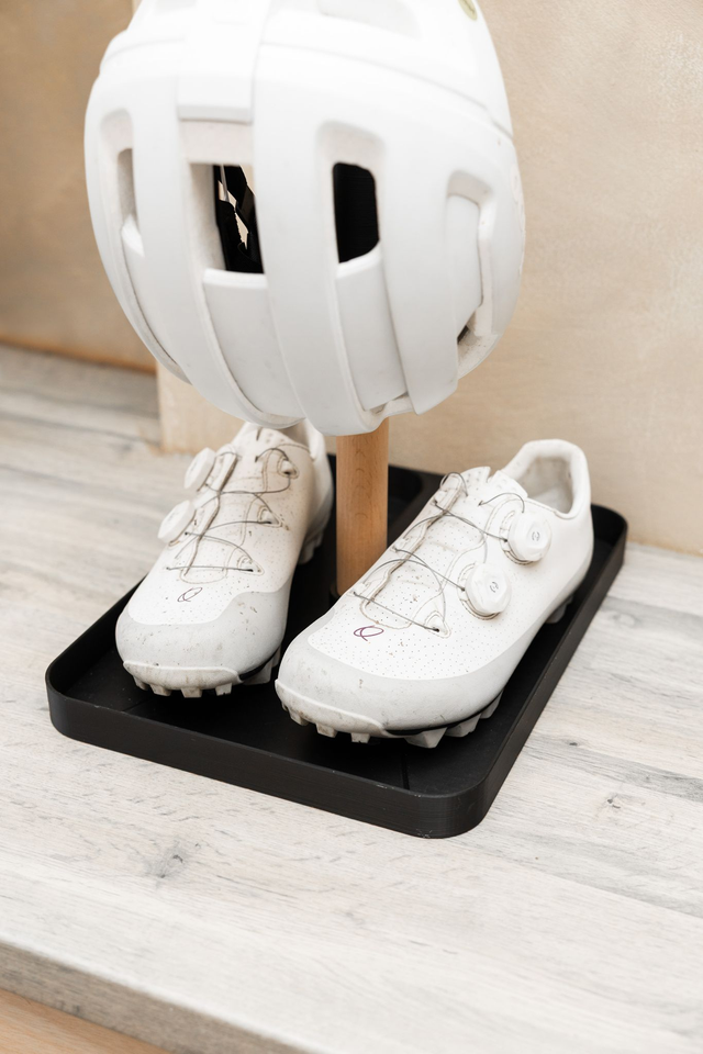 Built for the messier side of cycling life. This all-in-one setup features a spacious wooden tray at the base—perfect for muddy shoes—paired with a secure helmet hook and a 3D-printed glasses holder above. Designed to keep your gear organised and your floors clean, it’s a rugged yet stylish storage solution for everyday riders.